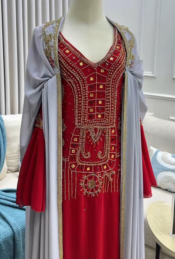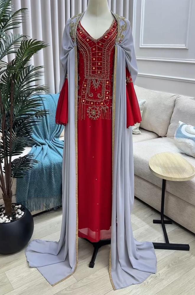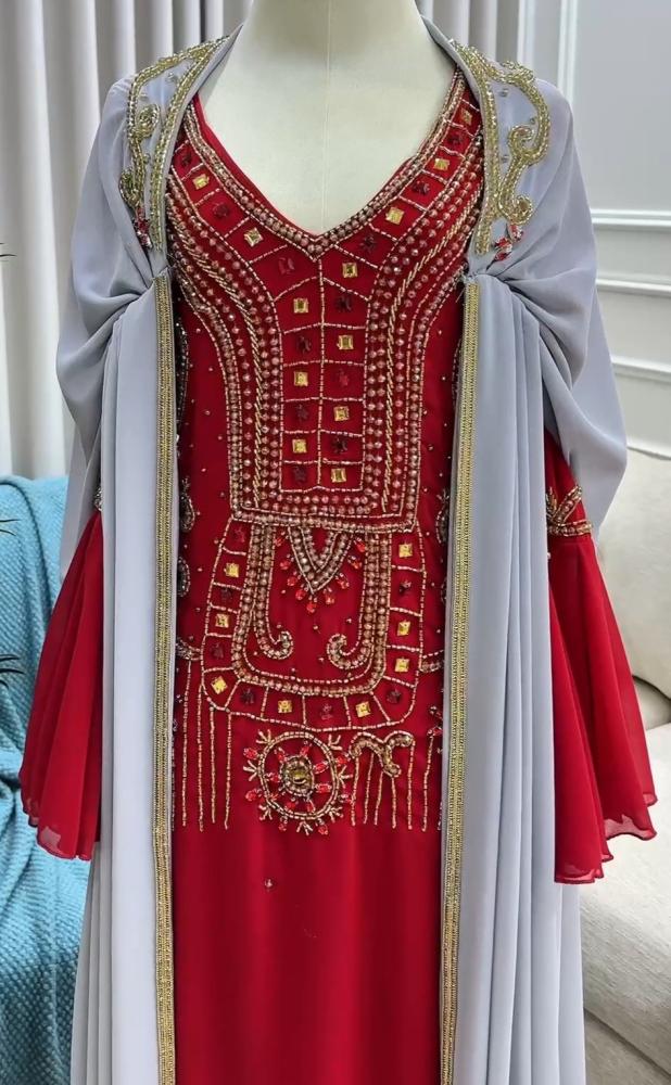 انسيابية قماش الجورجيت تنسجم مع تطريز يدوي دقيق، يمنح القطعة لمسة فنية نابضة بالحياة، تضيف غنى وحضوراً لكل حركة.