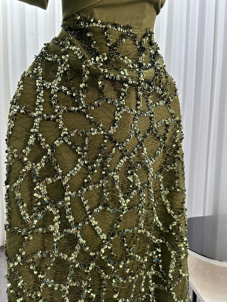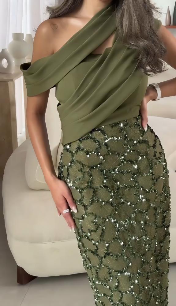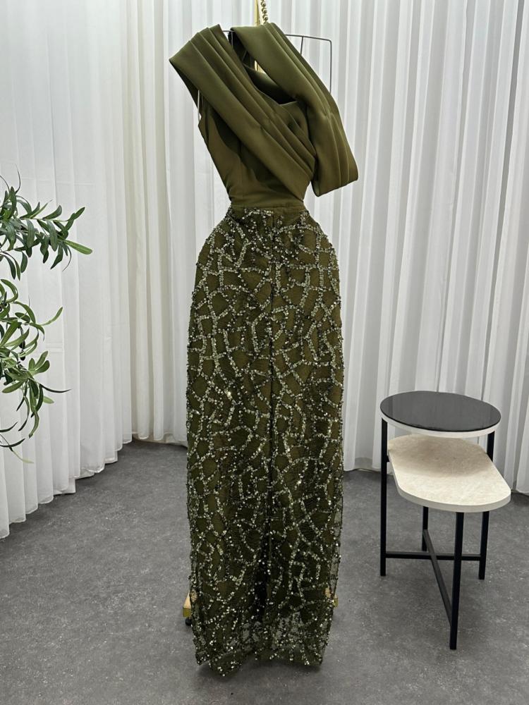 " ريتال " فستان بتصميم أنيق مع كتف واحد مطرّز بطيات عريضة تعطيه فخامة، والتنورة طويلة مشغولة بكلفة سهرة لامعة برسومات متداخلة.