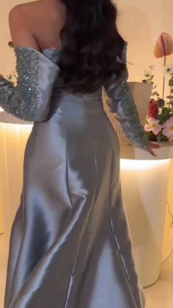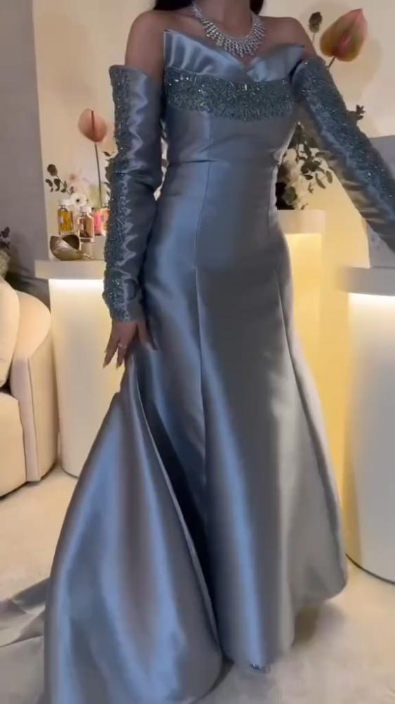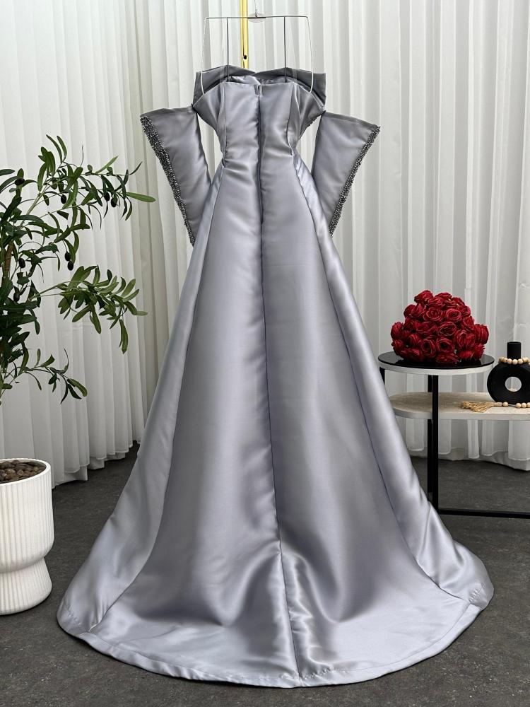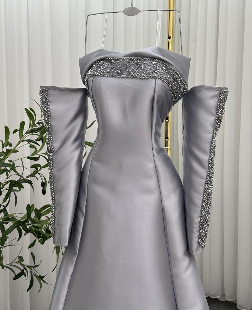 "بريق الفضة" فستان أنيق مصمم بعناية بتفاصيل جذابة تشمل أكمامًا طويلة مميزة وتطريزًا يدويًا فاخرًا يزين منطقة الصدر وحواف الأكمام، ليضفي لمسة راقية تليق بالمناسبات الفخمة.